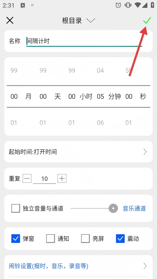 4、设置间隔计时时,输入【名称-间隔计时】,调整时间、重复次数等参数后,点击右上角【√】确认,即可启用该间隔计时功能。