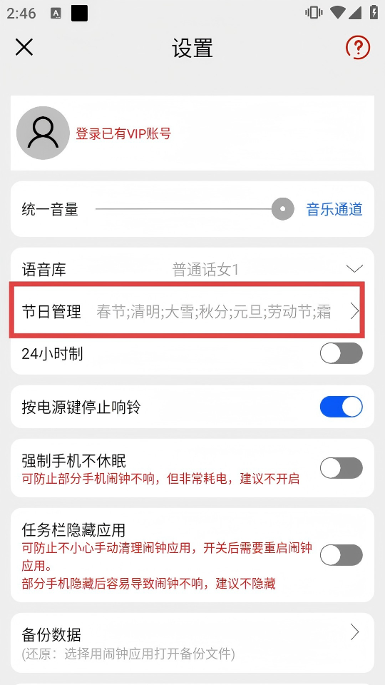 2、在设置中找到【节日管理】选项,点击进入可查看和管理已有的节日列表,如春节、清明等。