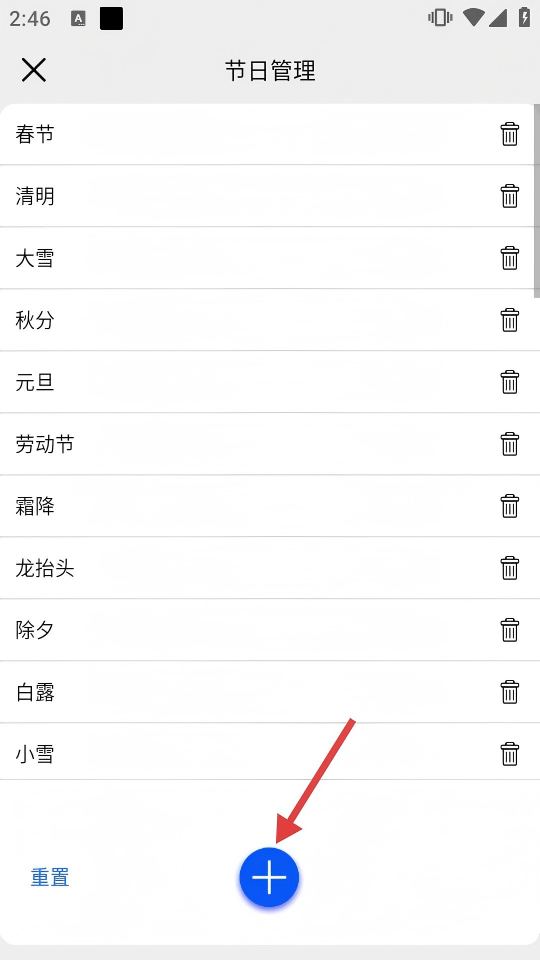 3、在节日管理界面,点击底部【+】号,可添加新的节日,丰富节日提醒类型。