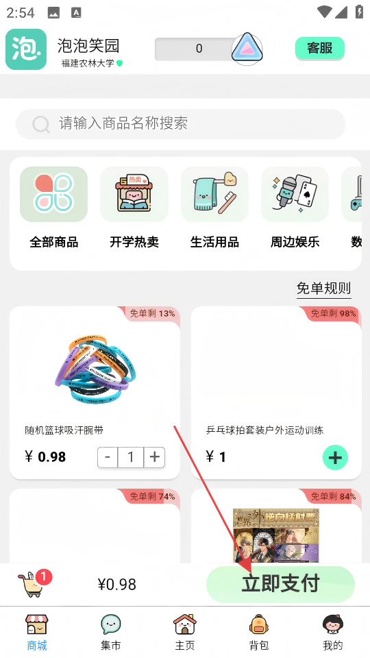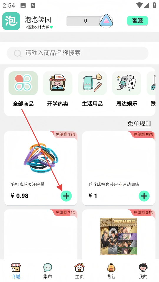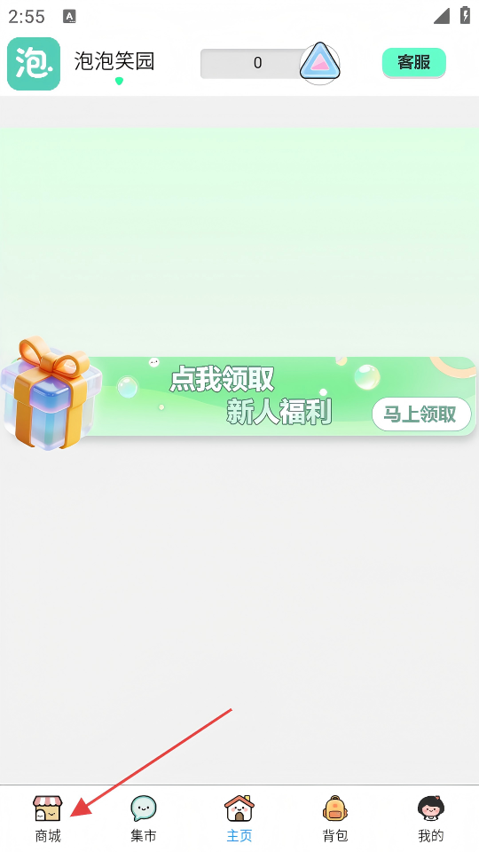 1、在“泡泡笑园”APP首页点击底部【商城】按钮,进入商城页面。