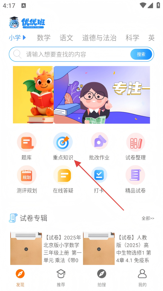 1、在优优班首页点击【重点知识】,进入重点知识页面。