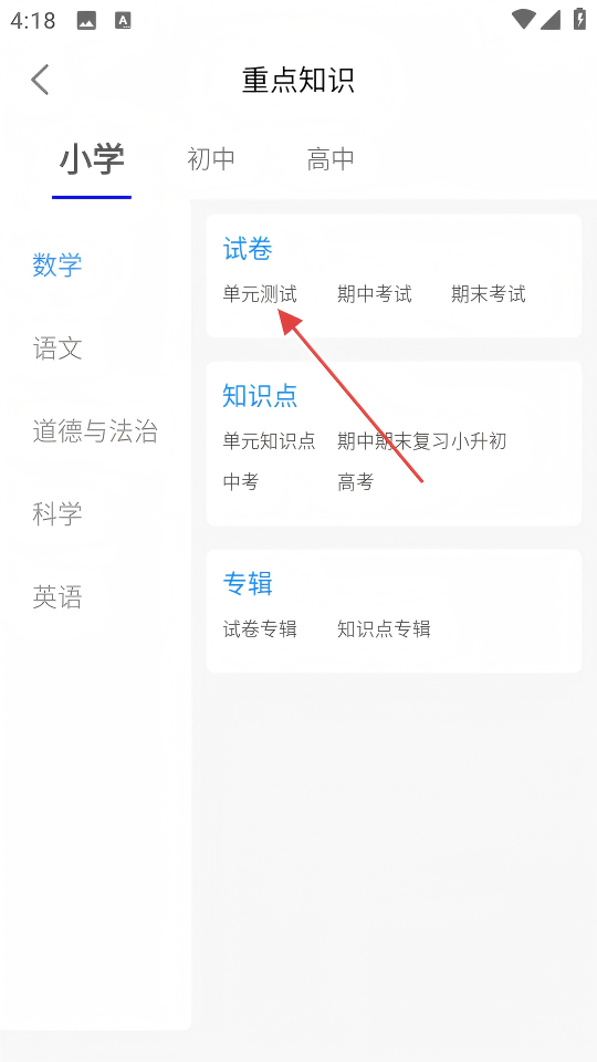 2、在重点知识页面的【试卷】板块中,选择【单元测试】等类型,进入试卷列表页面。
