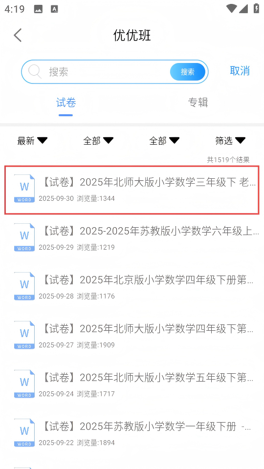3、在试卷列表中选择【2025年北师大版小学数学三年级下】的试卷,进入试卷详情页面。