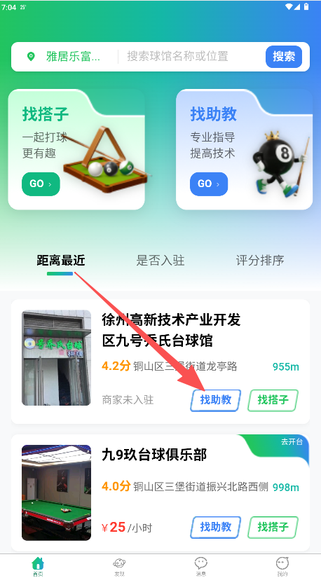 2、在首页“距离最近”列表选择目标球馆找助教。