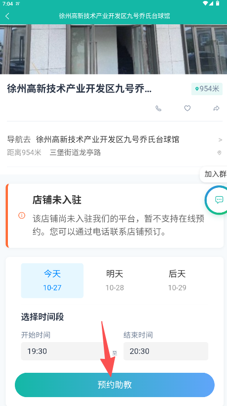 3、进入球馆详情页查看提示,若显示“店铺未入驻”则需电话联系,点击“预约助教”。
