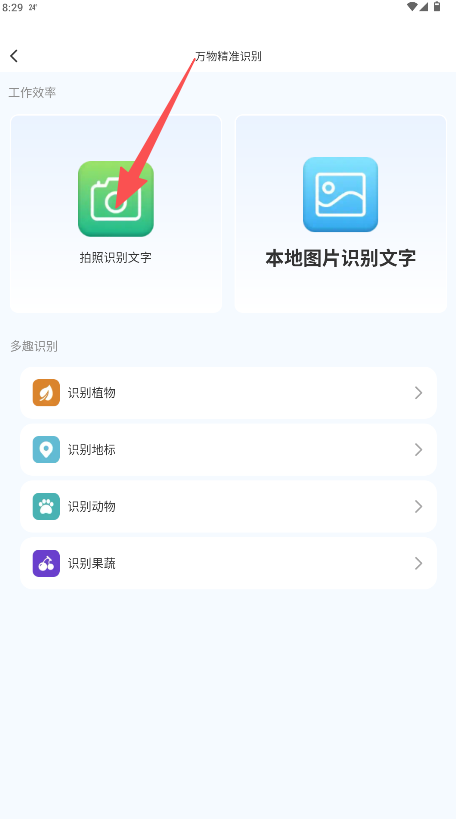 2、在“万物精准识别”页面的栏中选择“拍照识别文字”功能、准备拍摄待识别物体。