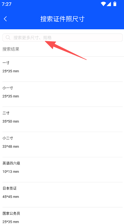 1、打开软件,点击搜索框,输入尺寸规格,查询证件照尺寸。