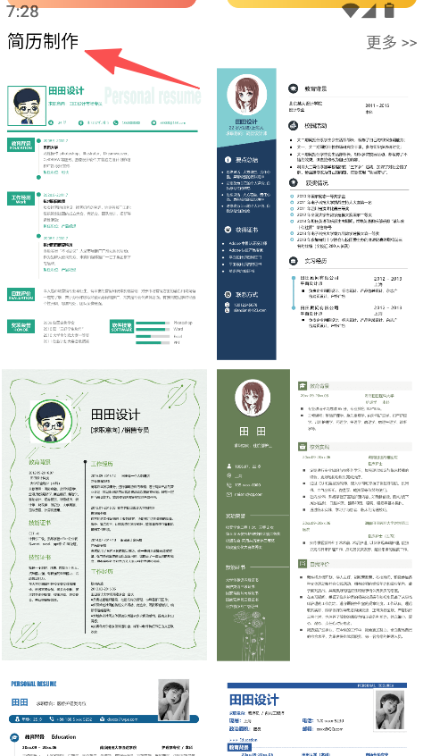 2、进入简历制作板块,浏览多样简历模板,选择心仪样式。