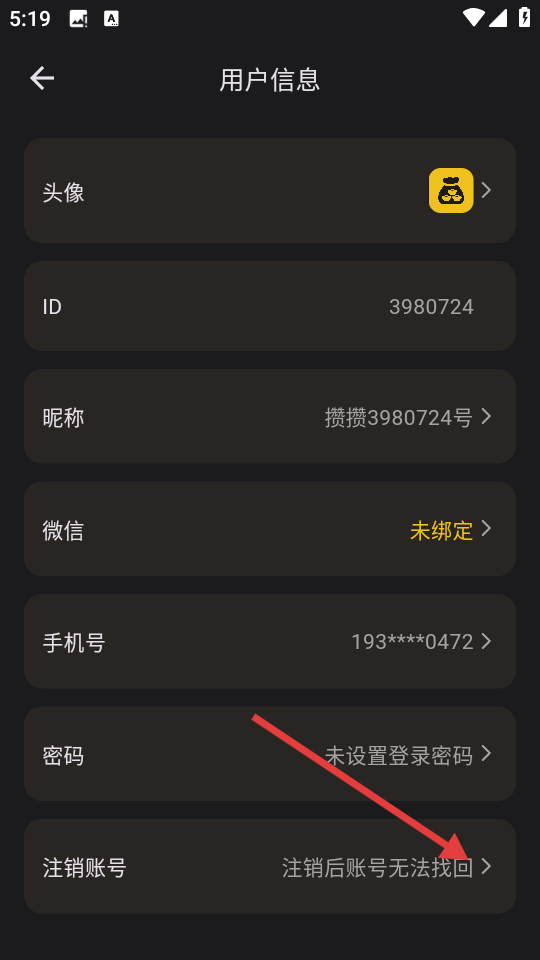 3、在用户信息页面,点击【注销账号】选项,进入注销账号确认页面。