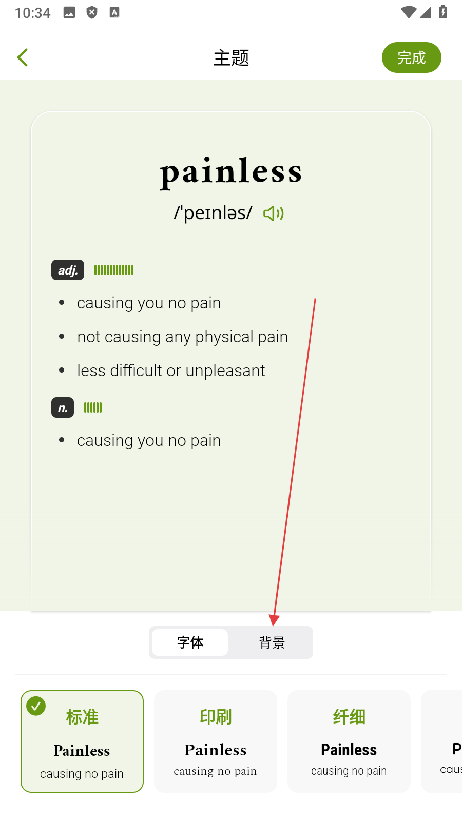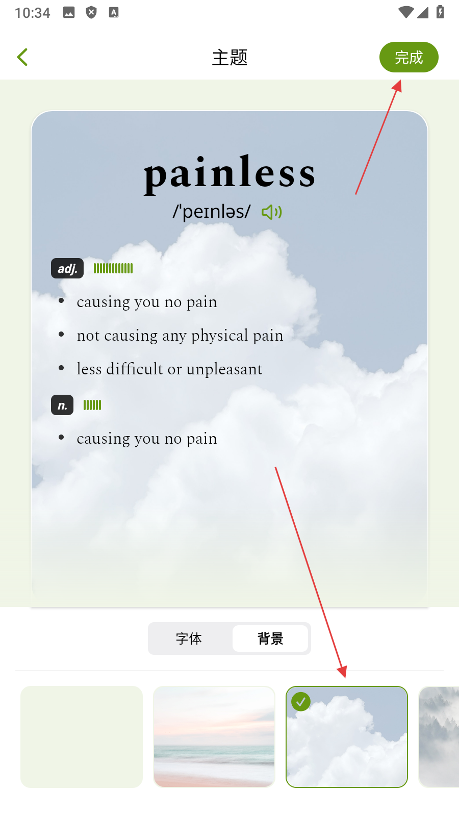 4、在背景选择页面【选择背景后】点击【完成】,即可完成主题背景设置操作。