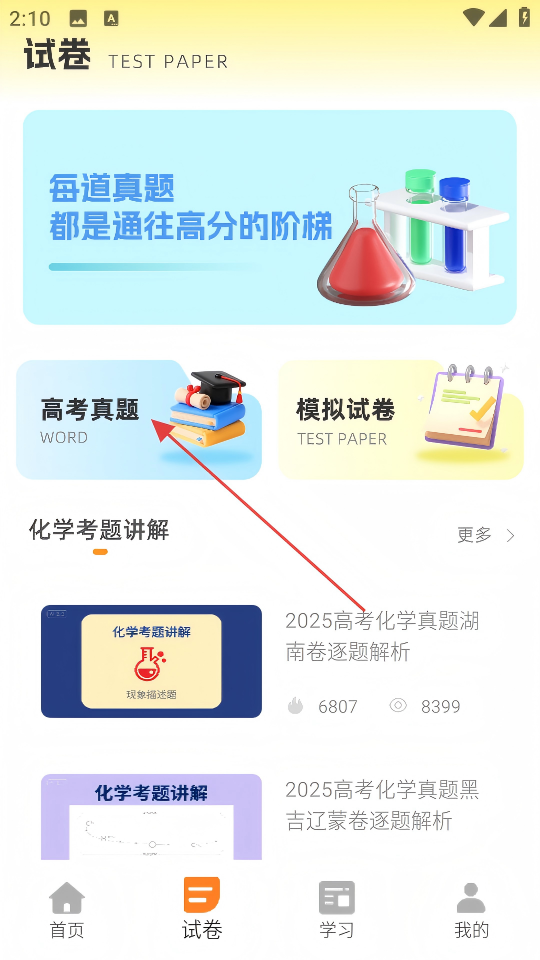 1、点击底部【试卷】选项,进入试卷页面,可查看高考真题、模拟试卷等分类。