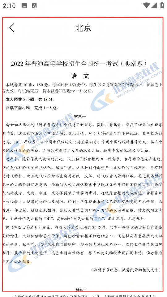 4、查看如2022年普通高等学校招生全国统一考试(北京卷)语文等真题内容。