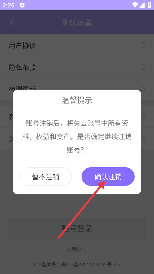 3、在系统设置页面中,点击【注销账号】,触发温馨提示弹窗。