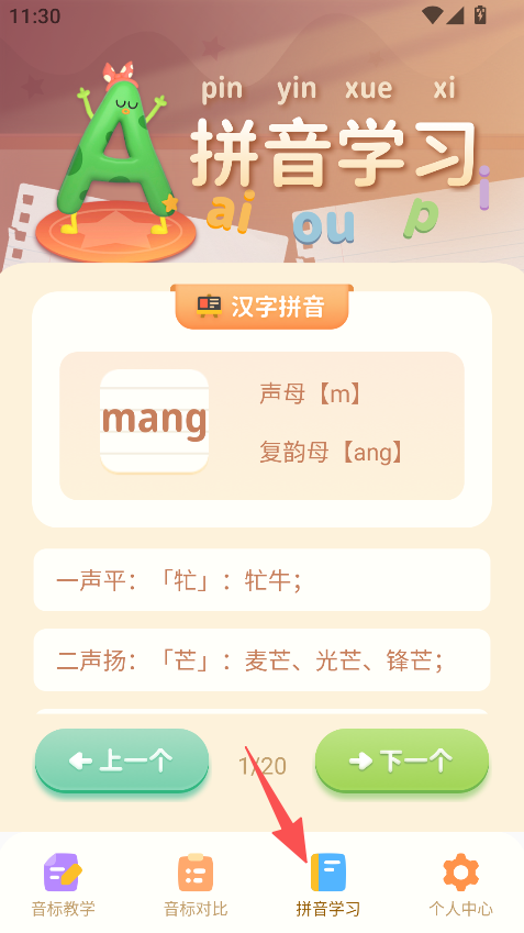 1、点击拼音学习,可学习汉字拼音。
