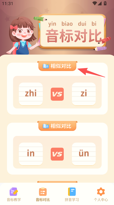 2、设置相似音标对比板块,将zhi与zi、in与ün等易混淆音标对比呈现,帮助学习者区分差异,增强拼音辨别能力。