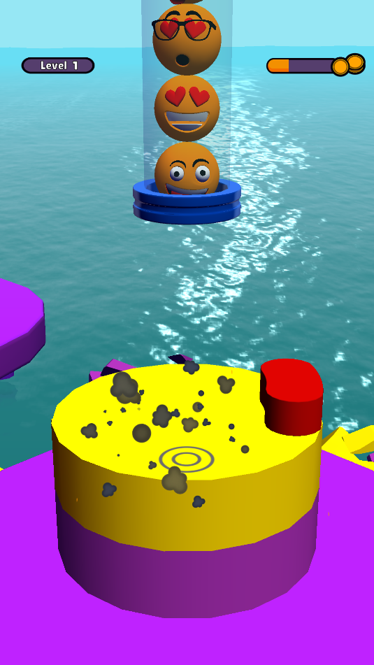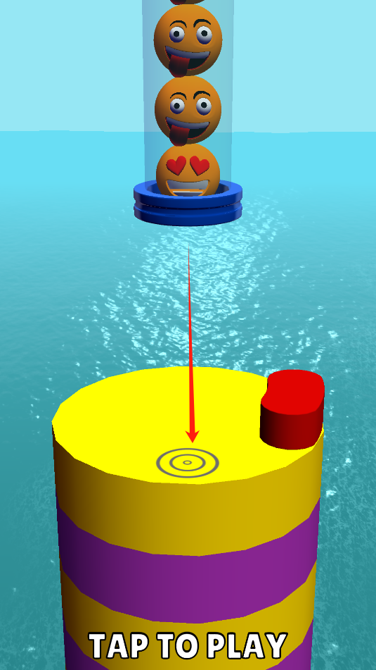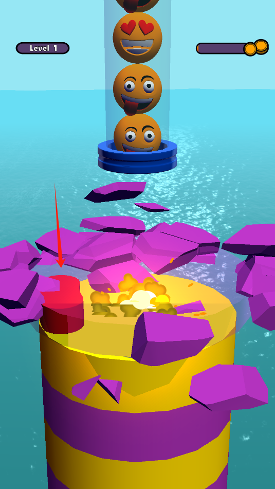 1、游戏中,点击屏幕使上方的球体自然下落,击中下方的圆环来消除。