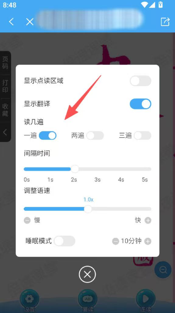 3、设置点读参数,选择读几遍、调整语速,个性化点读学习。
