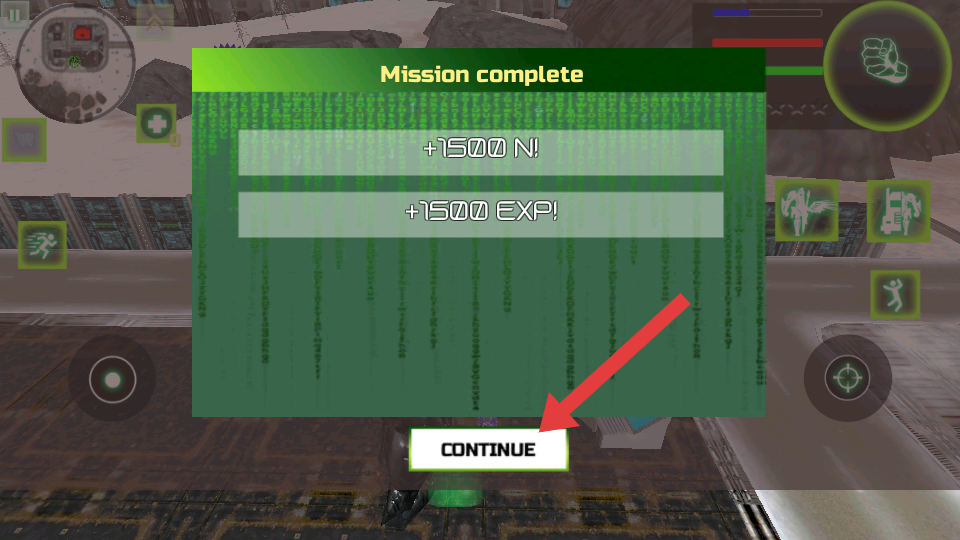 4、任务完成后,点击【CONTINUE】按钮,领取奖励(如+1500N和+1500EXP),继续下一个任务。