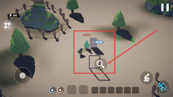 1、靠近【绿色角色】后点击【放大镜】图标,推进剧情进入下一步场景。