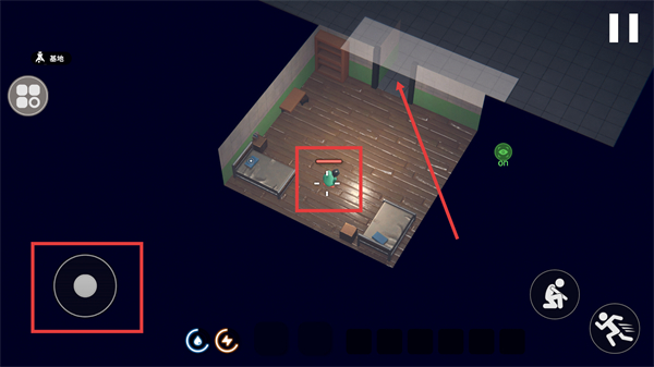 2、通过左下角【移动按钮】操控角色,往箭头指向的【门口】移动,离开当前房间进入新区域探索。