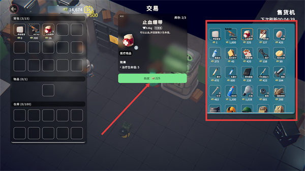 4、在【交易】界面中选中【止血绷带】,点击绿色的【购买】按钮,消耗货币获取该医疗物品。