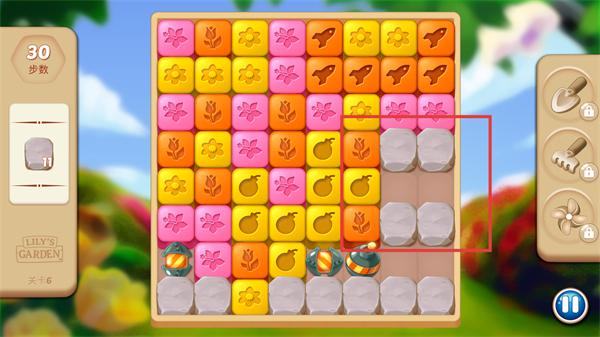 4、红框标注石块区域,消除对应方块可清除石块推进关卡进程。