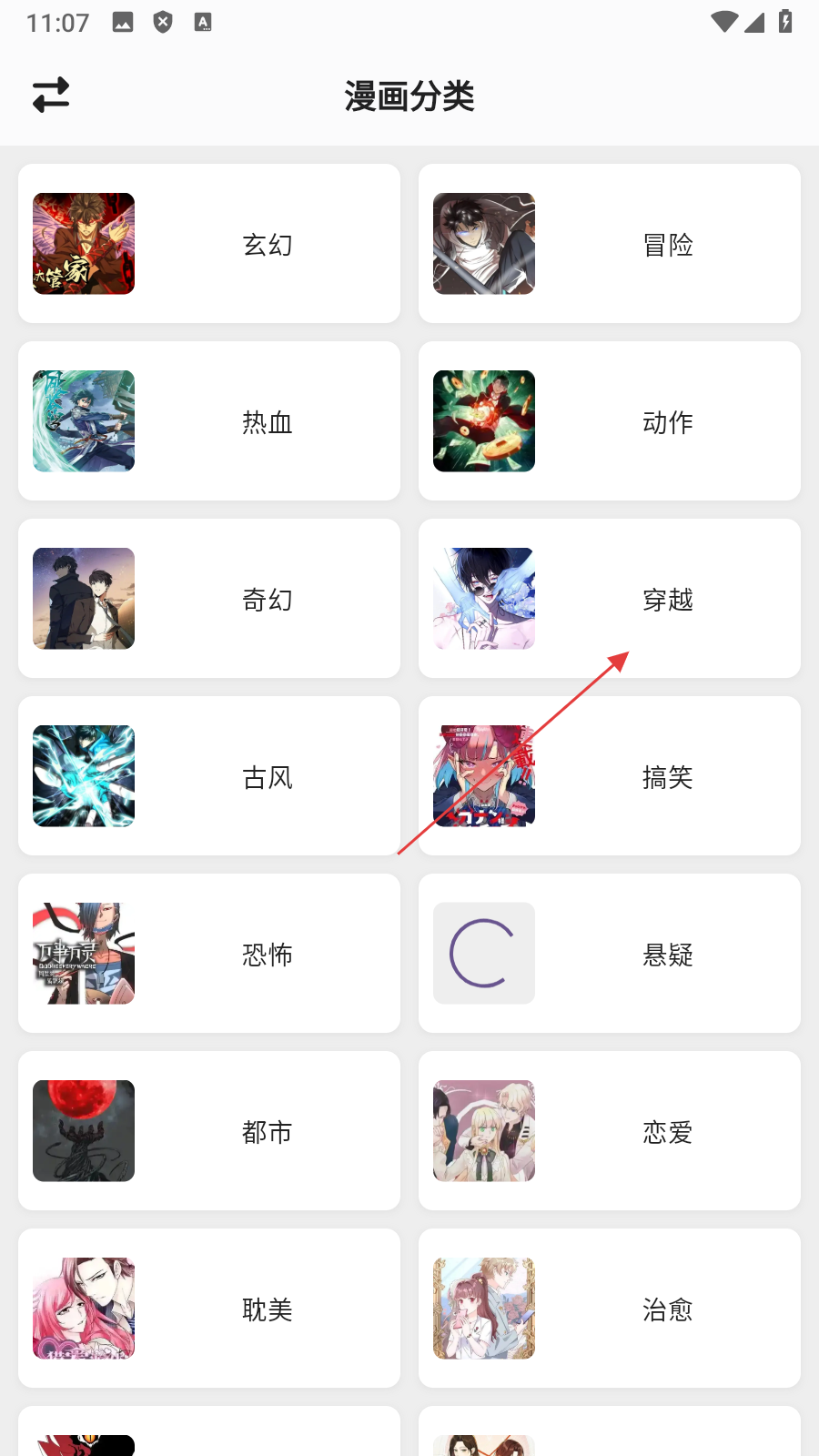 2、在漫画分类页面,点击【穿越】,进入穿越类漫画列表页面。
