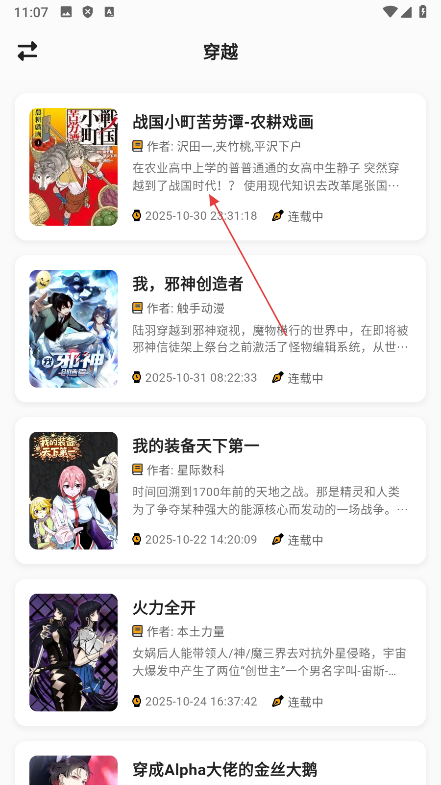 3、在穿越类漫画列表页面,点击【目标漫画】,进入漫画详情页面。