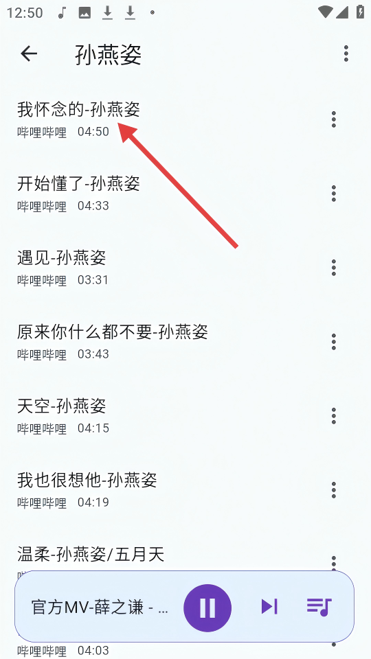 3、在孙燕姿的歌曲列表中,点击【我怀念的-孙燕姿】可进入该歌曲的操作界面。