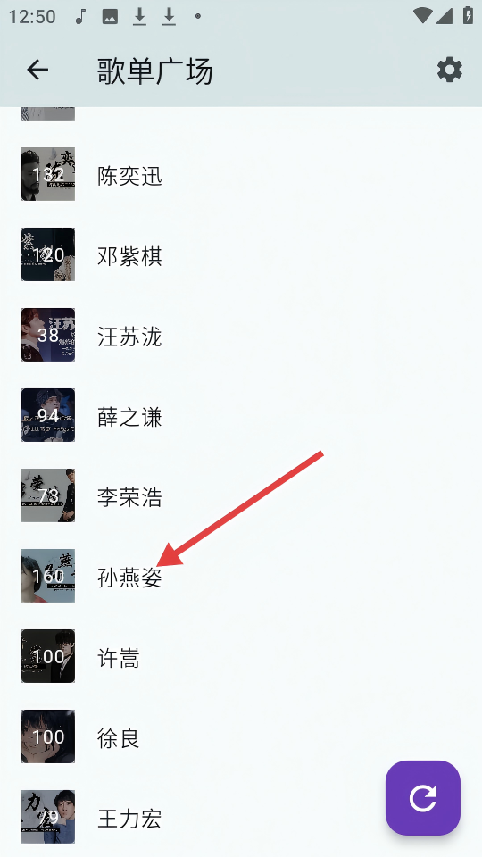 2、在【歌单广场】中,点击【孙燕姿】可进入其歌曲列表页面。