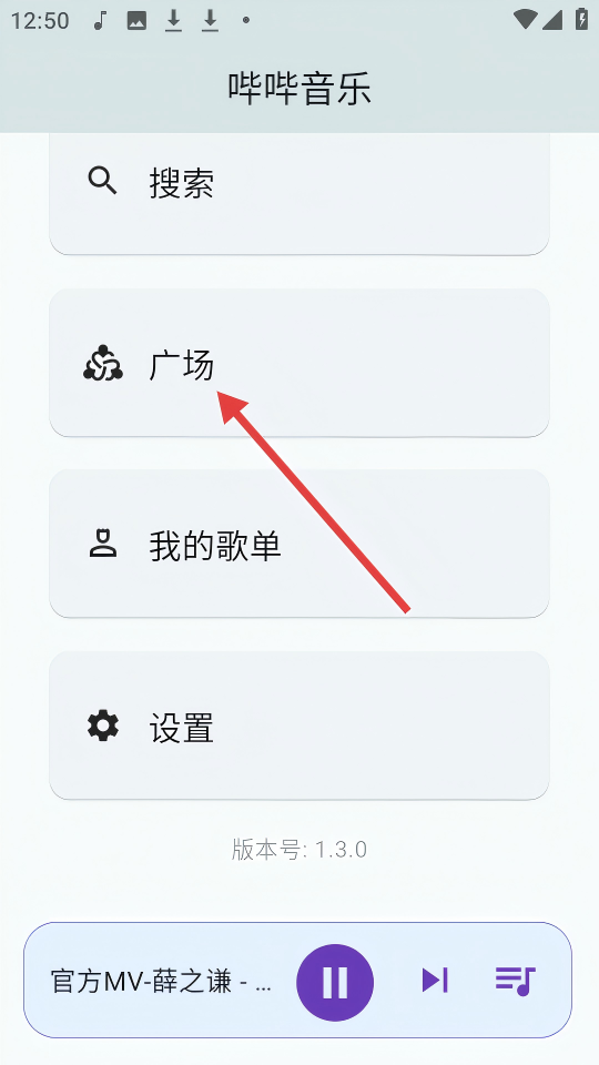 1、在哔哔音乐主界面,点击【广场】可进入歌单广场页面。