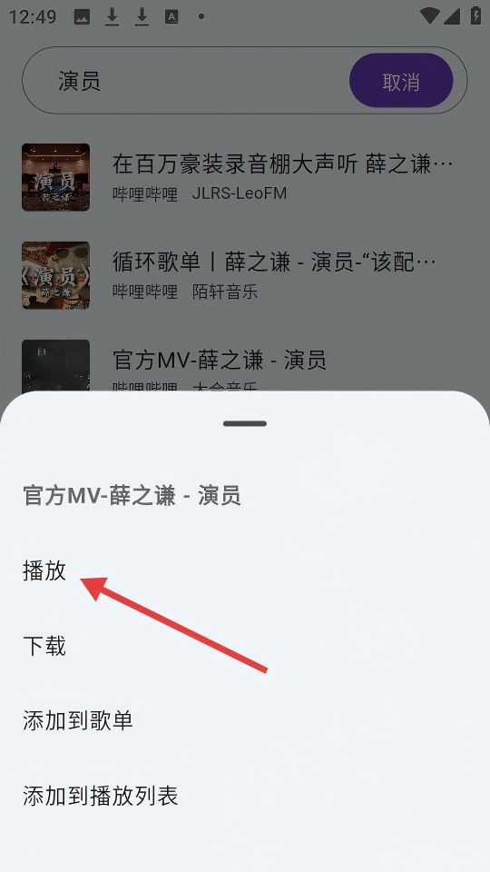 4、在【官方MV-薛之谦-演员】的操作选项中,点击【播放】可播放该MV。