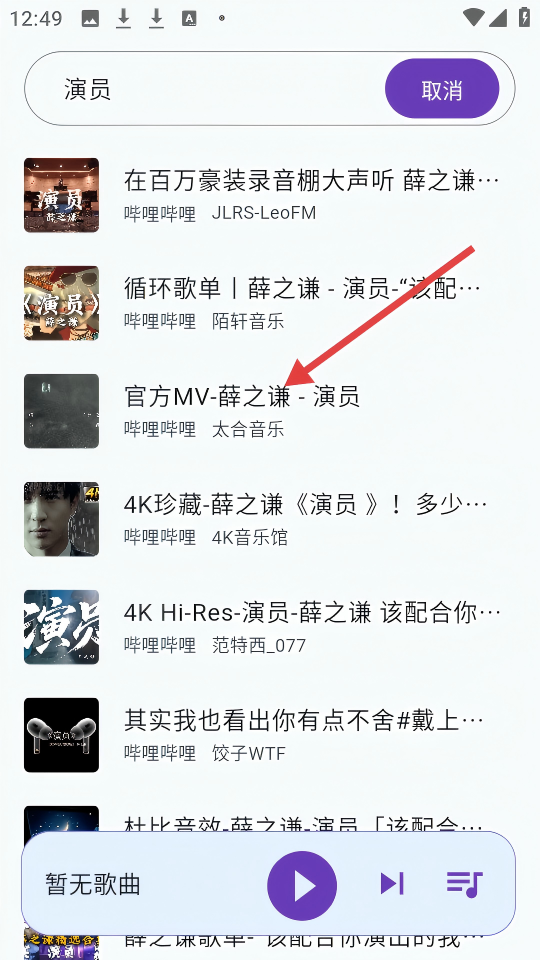 3、在搜索【演员】的结果中,找到【官方MV-薛之谦-演员】可进行后续操作。