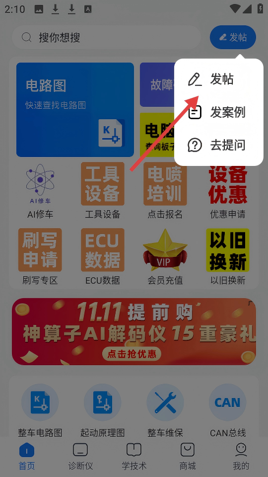 3、点击【发帖】按钮,可选择【发帖】【发案例】【去提问】操作。