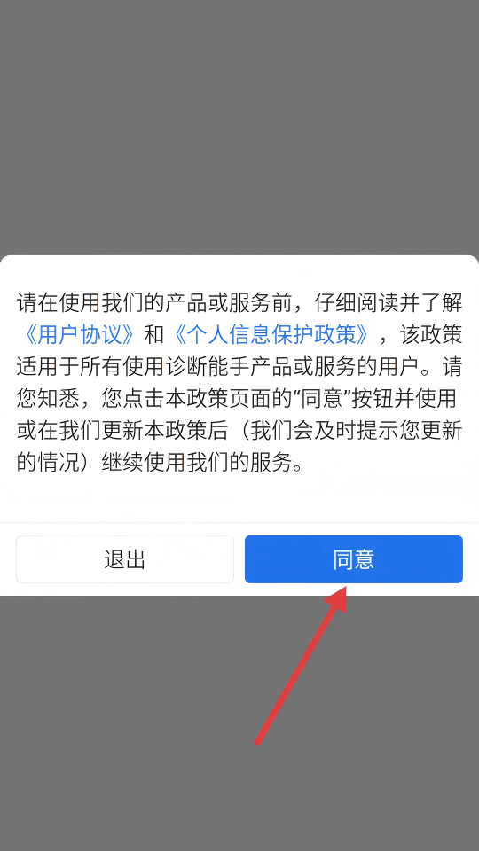 1、点击【同意】按钮,确认《用户协议》和《个人信息保护政策》。