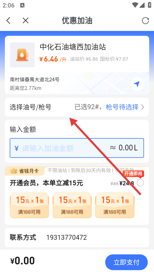 4、在加油站详情页面,选择油号/枪号并输入加油金额,并进行支付完成下单加油。