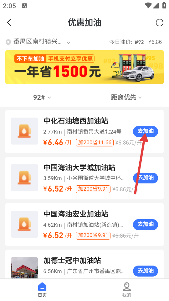 3、在优惠加油页面,选择目标加油站,点击“去加油”,进入加油站详情页面。