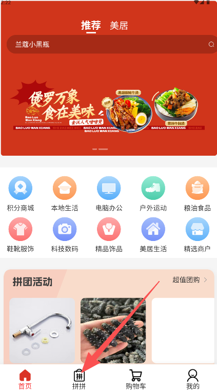 1、在首页底部导航栏点击“拼拼”按钮。