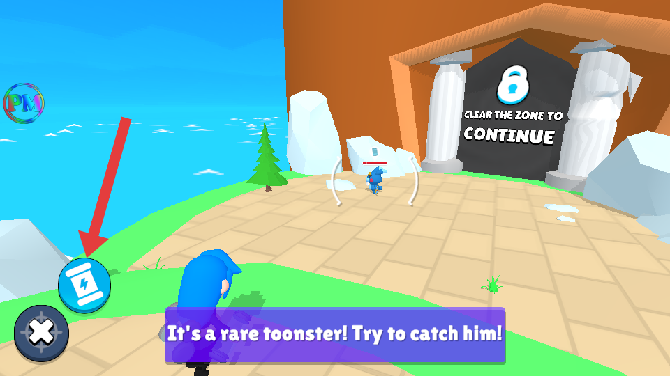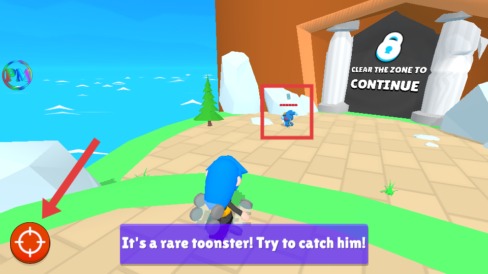 2、遇到稀有怪物(如蓝色Toonster)时,点击左下角瞄准按钮,瞄准怪物准备捕捉。