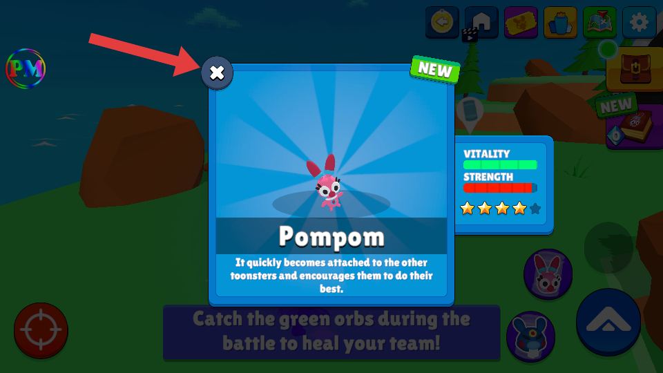 4、成功捕捉怪物(如Pompom)后,会弹出怪物详情界面,点击关闭按钮继续游戏。