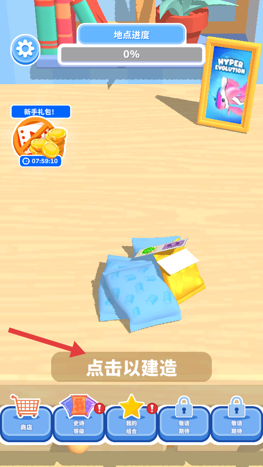 1、点击【点击以建造】,开始积木搭建流程,推进地点进度。