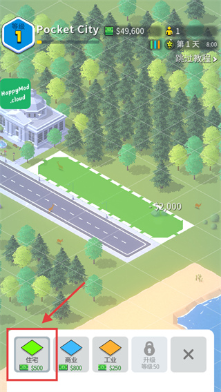 3、在道路旁选择区域,点击【住宅】-【$500】建设住宅,吸引市民入住,提升城市人口与活力。
