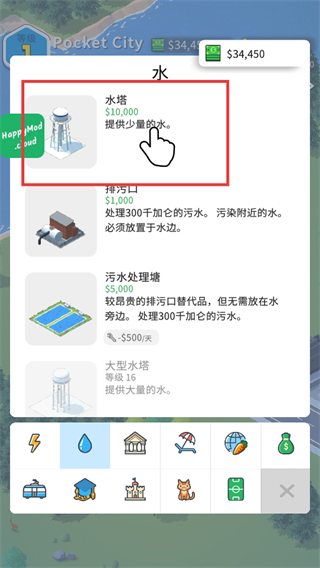 4、当市民用水需求出现时,点击【水塔】-【$10000】建设,可提供少量水,满足初期供水。