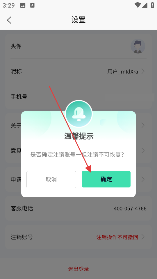 4、在温馨提示弹窗中,点击【确定】按钮,完成账号注销操作。
