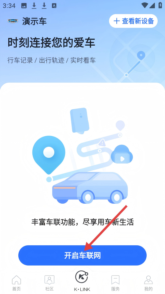 2、在K・LINK页面点击【开启车联网】,即可享受行车记录、出行轨迹等车联功能。