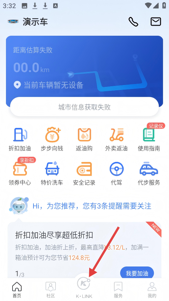 1、点击底部导航栏的【K・LINK】,可进入车联网相关页面,查看车辆信息及各类车联服务。