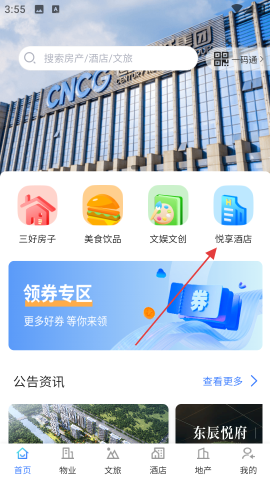 1、在软件首页,点击【悦享酒店】,进入酒店列表页面。