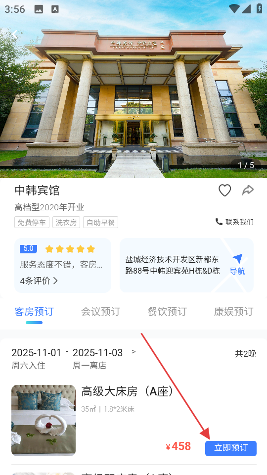 3、在酒店详情页,点击【立即预订】,进入酒店预订页面。