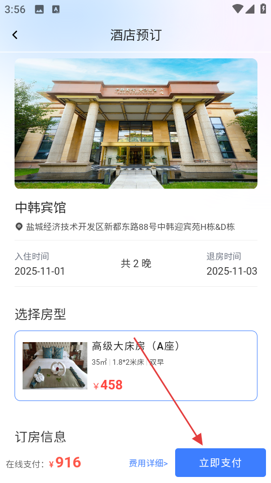 4、在酒店预订页面,确认信息后点击【立即支付】,完成酒店预订支付操作。