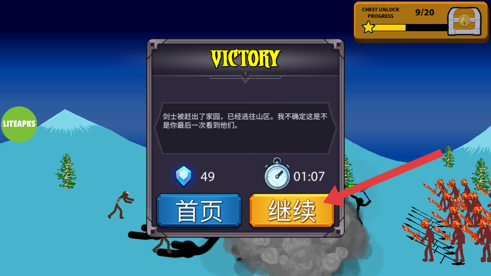 4、战斗胜利后,点击【继续】按钮,继续挑战后续关卡,积累资源、解锁新兵种,提升军队实力,不断推进游戏进程。